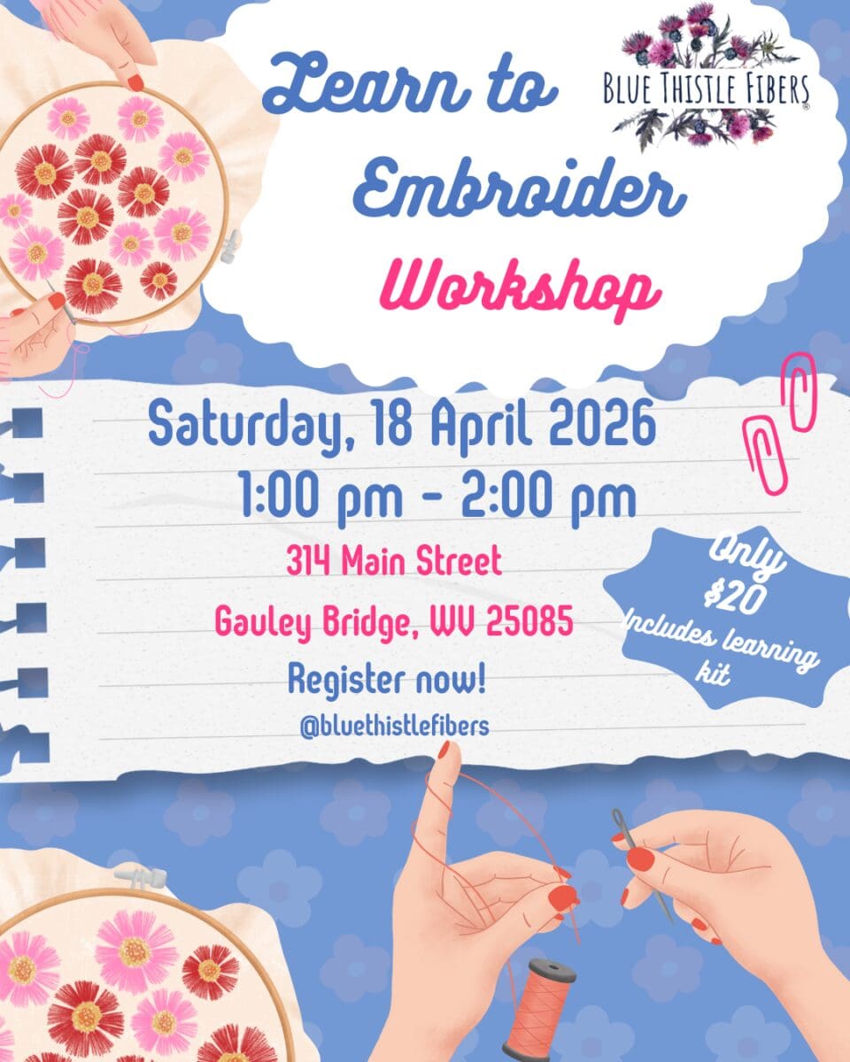$20.00Learn to Embroider Workshop – Gauley Bridge, WV | April 18th, 2026