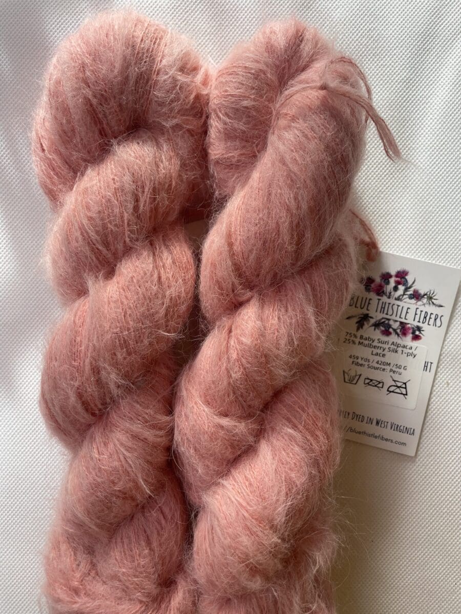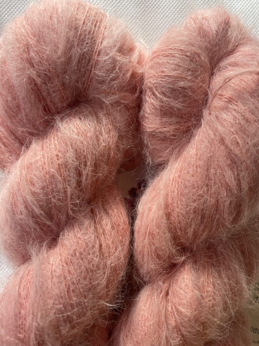 Light Strawberry Mohair is our 1-ply. made from 70% Super Kid Mohair, 30% Mulberry Silk, is silky soft and perfect for an entire sweater or to be threaded with one of our wool yarns.