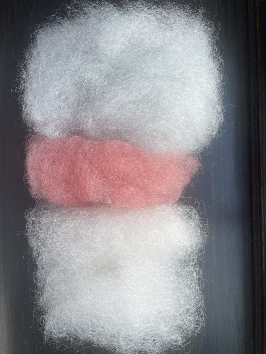Multi Colorway: Red, White & Blue Cotswold Hand-Carded Roving are perfect for felting, spinning, and other crafts—net weight: 5 grams. Staple length – Mixed between 1 inch and 2 inches. There may be second cuts, neps, felted sections or minor VM.